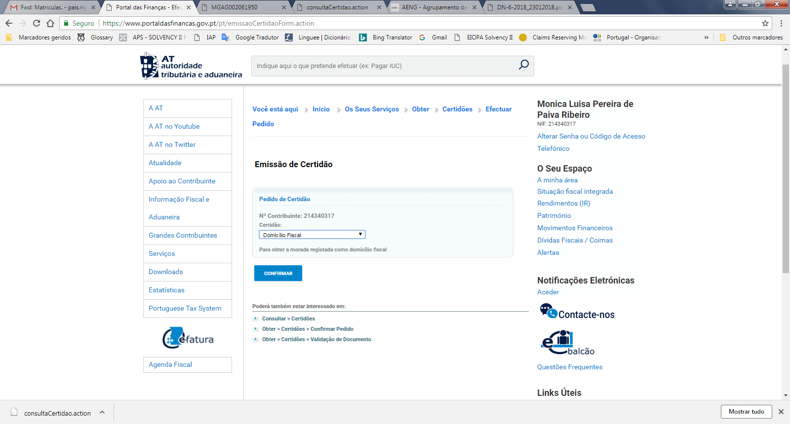 Uma vez aqui carregar no botão “Confirmar”, aparecerá a identificação do contribuinte e um botão “Obter”. Clicando em obter aparece automaticamente a certidão.