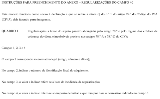Segundo o legislador, esta alteração visa alertar para uma nova forma de preenchimento da declaração motivada pela necessidade de adequar “as instruções de preenchimento do anexo de regularizações do campo 40 à finalidade de controlo dos prazos de efetivação das regularizações, destina-se a presente portaria a alterar a natureza do documento cuja data de emissão (ano/mês) deve ser inscrita no quadro 1-A do anexo regularizações do campo 40, quando as mesmas sejam efetuadas ao abrigo do disposto no n.º 2 do artigo 78.º do Código do IVA.