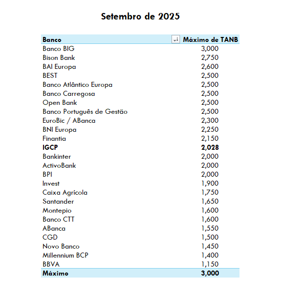 Eis a lista com indicação do banco, prazo, nome do depósito, taxas anualizadas bruta e líquida e depósito mínimo. Pode encontrar mais detalhes na nossa base de dados em excel com os melhores depósitos a prazo em setembro de 2025.