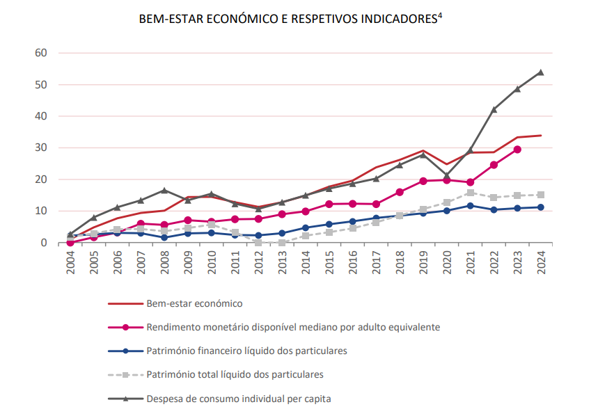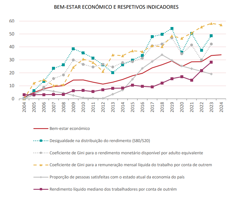 O Índice de Bem Estar apurado pelo INE bateu em 2024 o recorde da série iniciada em 2004. Nunca nestes 20 anos o conjunto dos 10 índices sintéticos e respetivas dimensões que dão forma ao Índice de Bem Estar relevaram uma situação tão positiva. A evolução neste 20 anos teve soluços durante a crise financeira (2008), durante o período da troika (2011-2013) e no pico do COVID (2020) mas a verdade é que a tendência tem sido clara e francamente positiva.