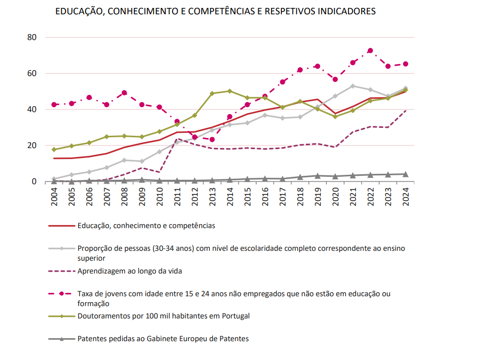 Educação, conhecimento e competências – através da caracterização da educação formal, da aprendizagem ao longo da vida, da qualidade de educação e nível de competências adquiridas e da produção de conhecimento e inovação;