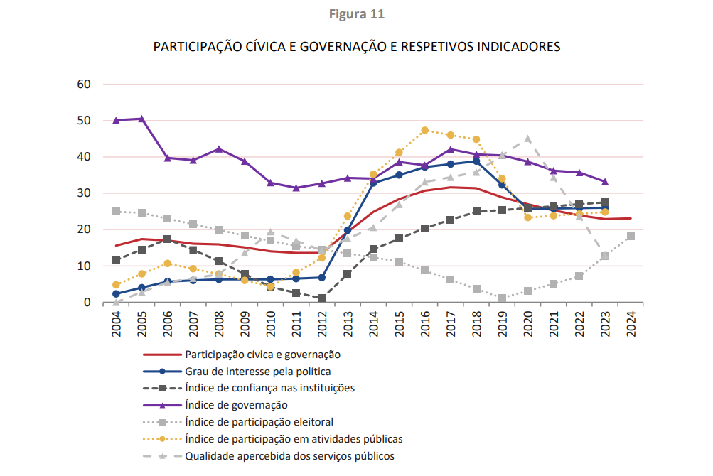 - Outro aspeto analisado e igualmente em contraciclo não se prende apenas com um indicador isolado mas antes com uma dimensão inteira de análise, a dimensão da Qualidade de Vida. Também esta dimensão melhorou entre 2004 e 2018, no entanto, de então para cá, têm predominado as variações no sentido descendente e 2024 não regista nenhum máximo histórico. De entre os domínios que integram o Índice de Qualidade de Vida há uma que se destaca claramente por estar a ser persistentemente negativa: o domínio da Participação cívica e governação. A evolução desde 2028 tem sido especialmente negativa acompanhado por um disparar do índice de participação eleitoral e por uma degradação a pique da qualidade percebida dos serviços públicos.