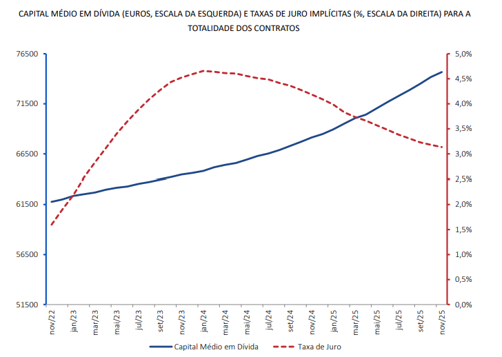 - Nos contratos celebrados nos últimos três meses, a taxa de juro subiu pela primeira vez desde abril de 2025, de 2,850% em outubro para 2,853% em novembro.