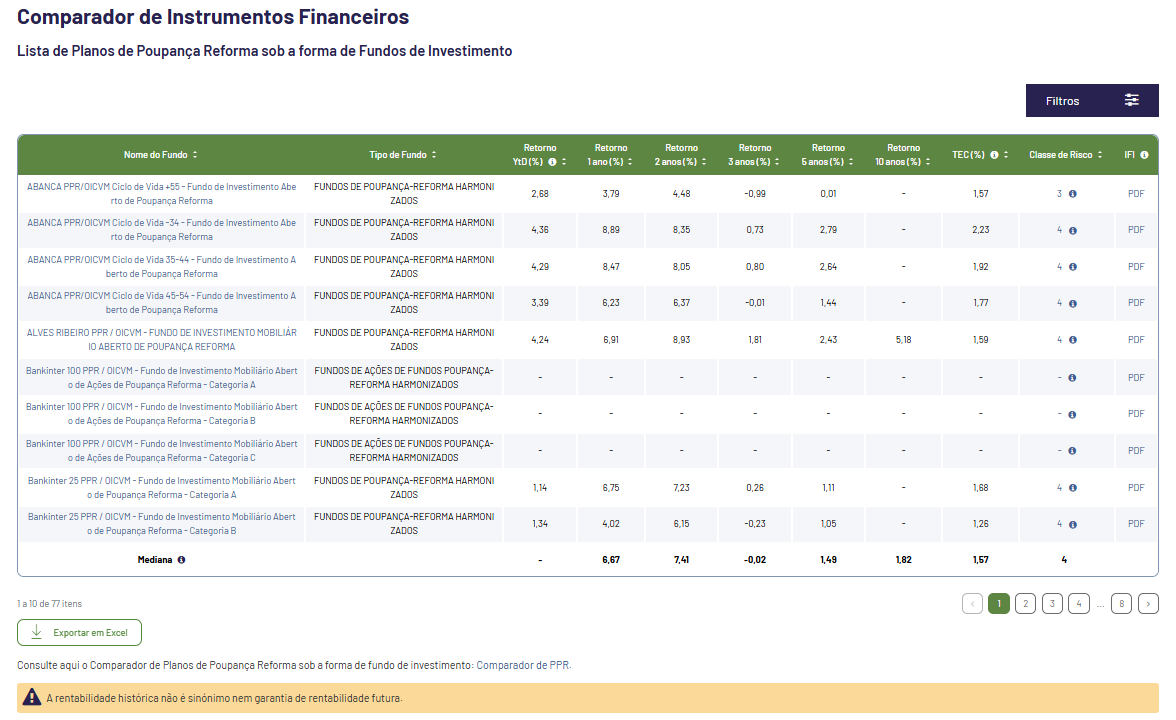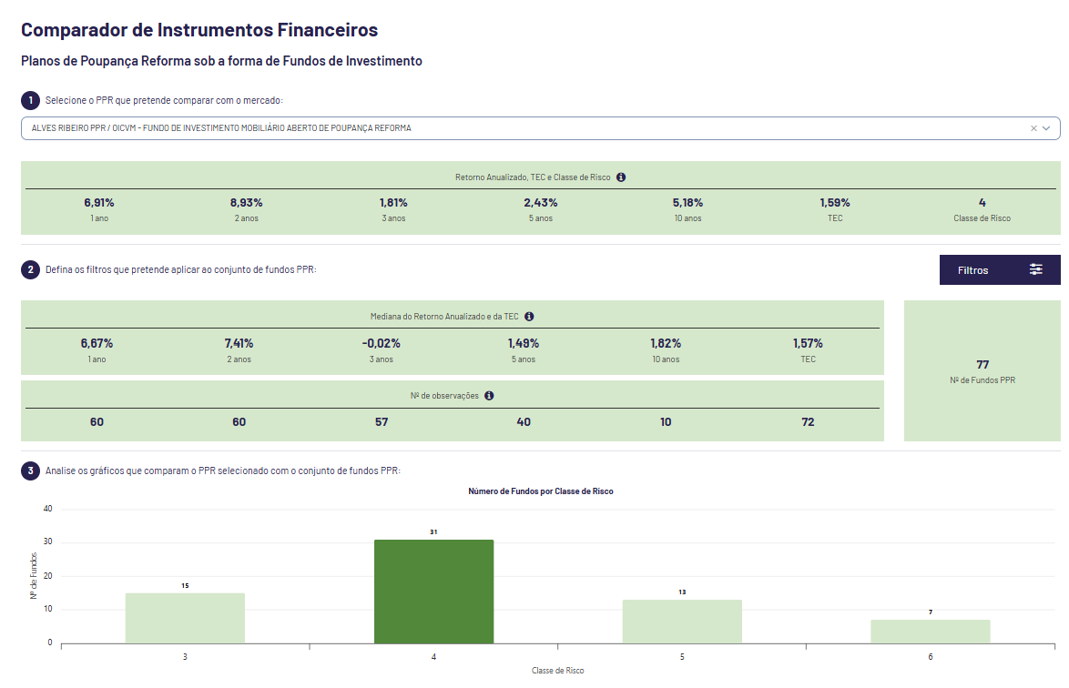 Qual o PPR que ofereceu os melhores retornos? E como comparam em termos de custos? E de riscos? A Comissão do Mercado de Valores Mobiliários CMVM, um dos três reguladores e supervisores financeiros nacionais, procura ajudar a responder estas pergunta através do comparador de instrumentos financeiros lançado a 15 de dezembro de 2025 e que nesta fase abrangerá Planos Poupança Reforma (PPR) sob a forma de fundos de investimento.