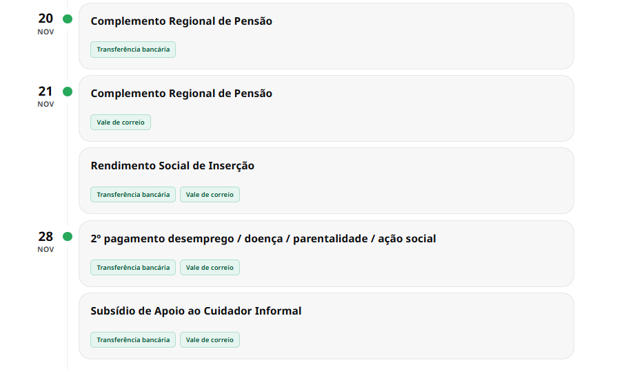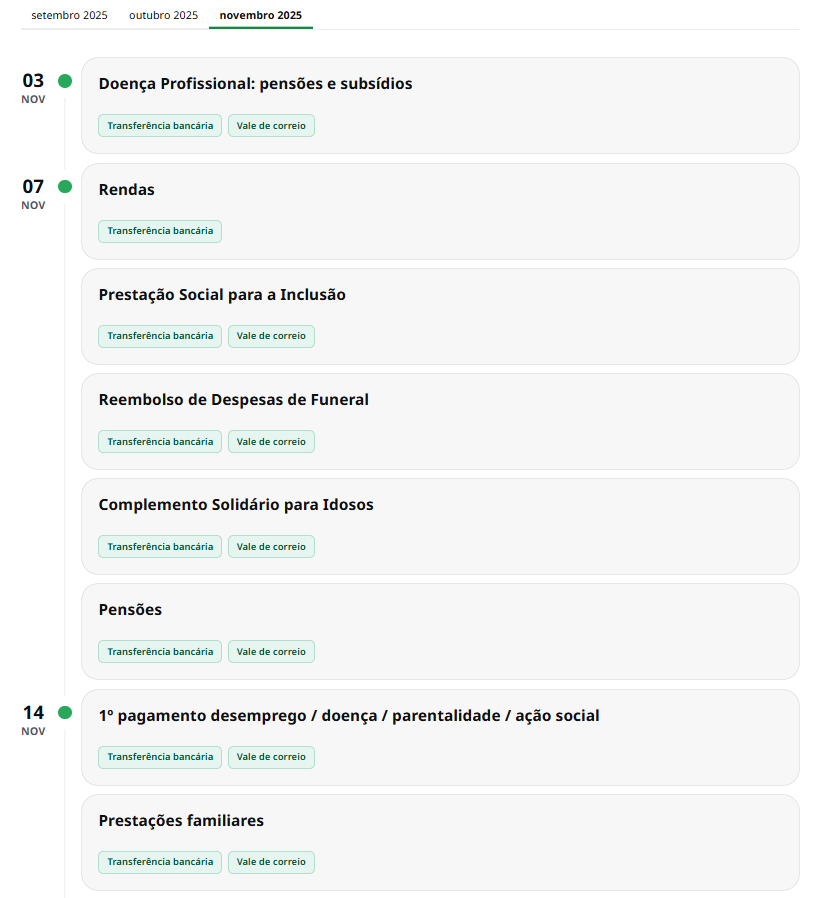 Como habitualmente, o sítio da Segurança Social divulgou o calendário com as datas de pagamento das prestações sociais – novembro de 2025 que aqui reproduzimos.