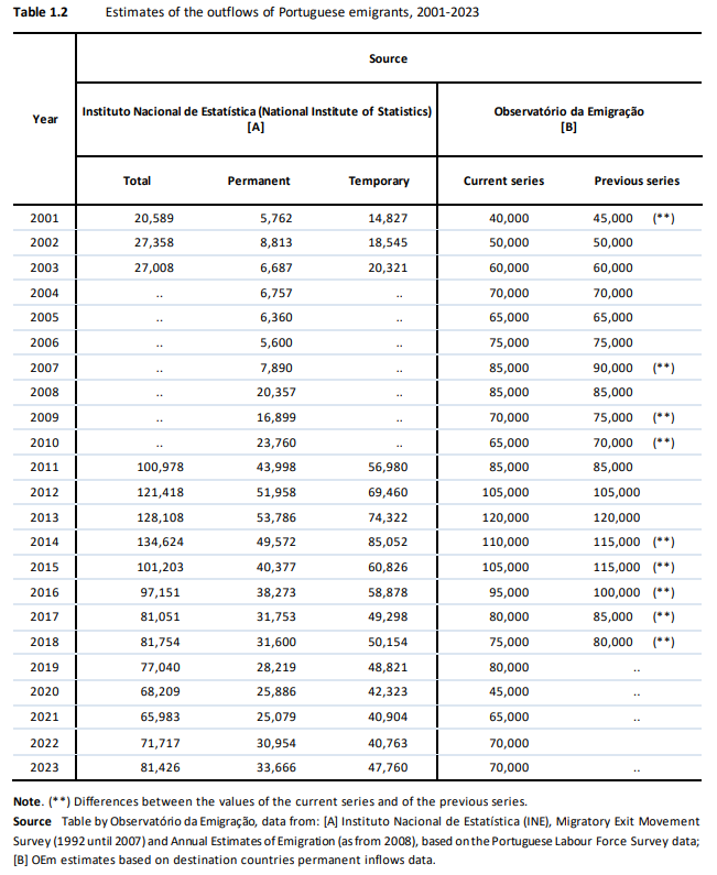 Nas estimativas mais recente compiladas e agora publicadas pelo Observatório da Emigração no seu Portuguese Emigration Factbook 2024, (editado em novembro de 2025) apurou-se que a emigração Portuguesa estabilizou nas 70.000 saídas. Os dados de 2023, agora estimados, ficam muito próximos dos de 2022 (entretanto melhorados com mais informação definitiva).