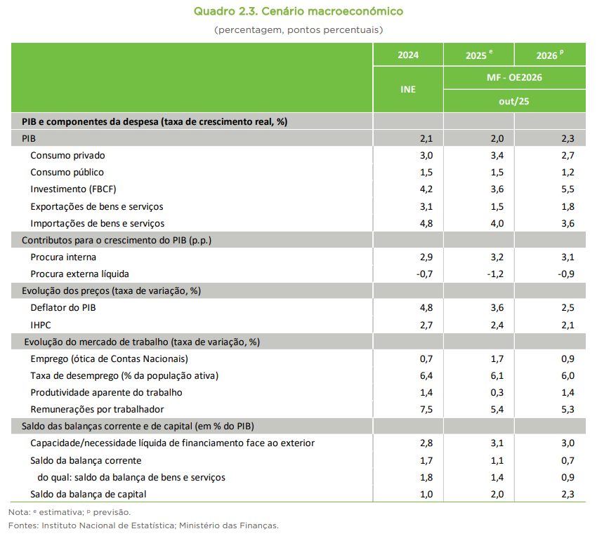 Deixamos na imagem em baixo o cenário macroeconómico considerado pelo governo na preparação da sua proposta de OE 2026.