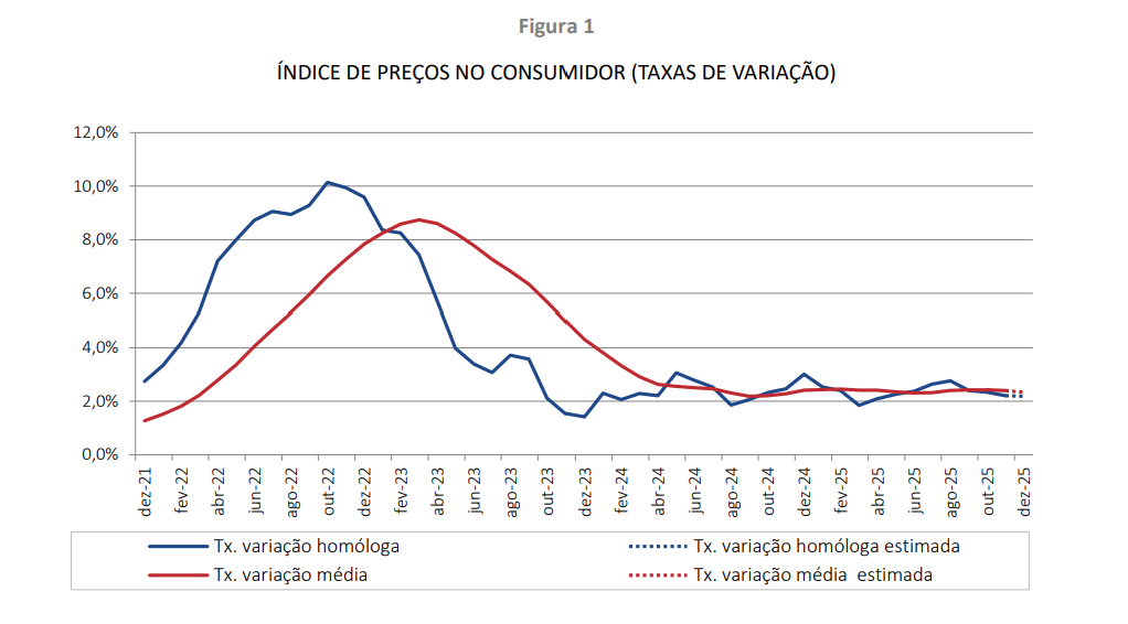 O Instituto Nacional de Estatística (INE) divulgou a estimativa preliminar (confirmada a 13 de janeiro com os dados finais aqui) para o índice de preços no consumidor de dezembro. Esta estatística, apesar de ainda poder sofrer alguma revisão marginal até ao início de janeiro de 2026, dá-nos igualmente uma estatística preliminar para a taxa de inflação em 2025. Assim, a taxa de inflação em 2025 foi de 2,3%.
