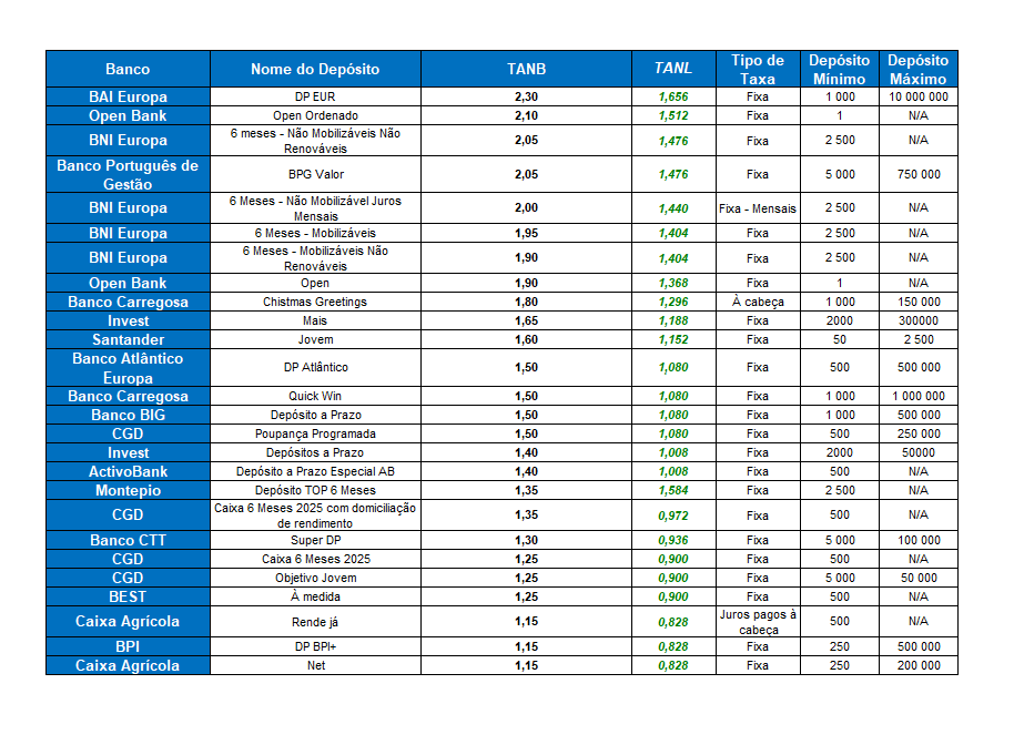 | Banco | Nome do Depósito | TANB | TANL | Tipo de Taxa | Depósito Mínimo | Depósito Máximo |