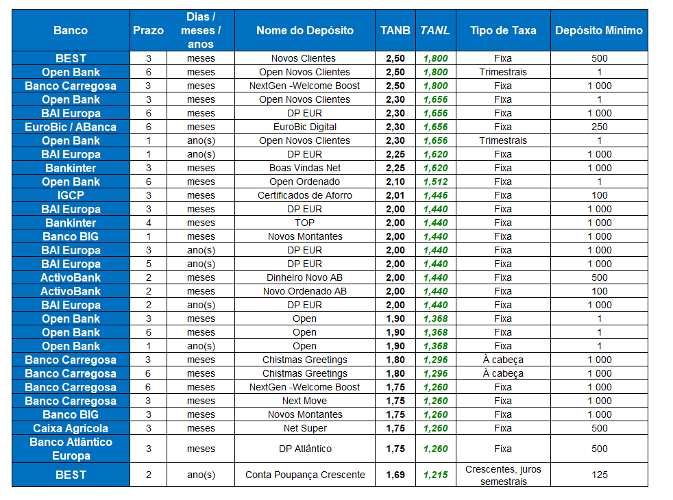 | Banco | Prazo | Dias / meses / anos | Nome do Depósito | TANB | TANL | Tipo de Taxa | Depósito Mínimo |