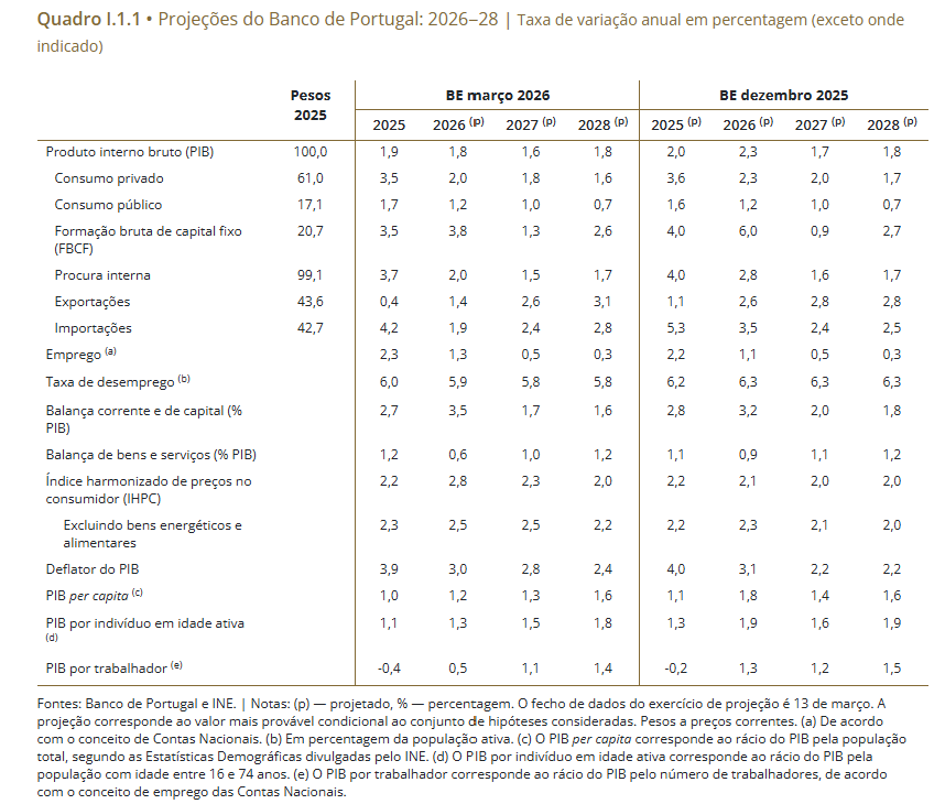 Para mais detalhes, poderá ler o Boletim Económico de Março de 2026 do Banco de Portugal.
