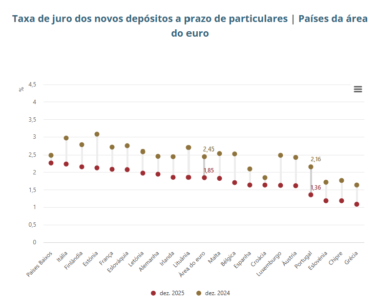 Se limitarmos a análise dos depósitos a prazo apenas às famílias, a taxa de juro média de novos depósitos a prazo até um ano fixou-se, em dezembro de 2025, nos 1,36% descendo 0,01 pp face a novembro.