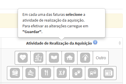 Na imagem, constam os símbolos das categorias em vigor até 31 de dezembro de 2025 que se manterão em vigor em 2026 mas às quais se juntarão as da lista acima descrita, que, provavelmente, serão condensadas num novo botão único (Bens e serviços culturais, ou algo equivalente) para facilitar a classificação das faturas cuja arrumação não seja feita automaticamente pelas Finanças.