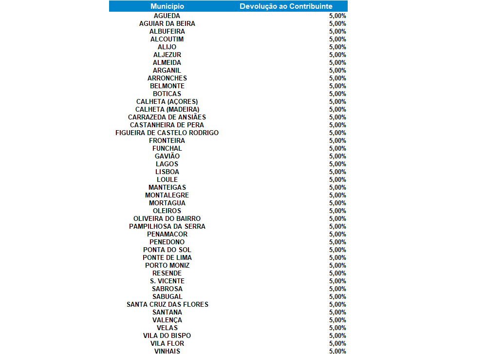 Na lista em baixo, em vez de divulgarmos a taxa de participação dos municípios no IRS como consta no Portal das Finanças, divulgamos o seu inverso, ou seja, a taxa de devolução do IRS ao munícipe pelo concelho que, como dissemos, poderá ser, no máximo, de 5% do total de IRS pago por cada residente ao Estado durante o ano de 2025.